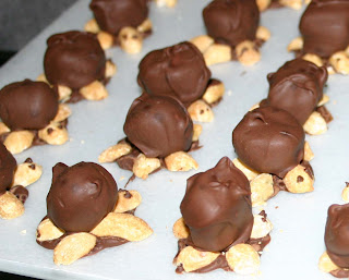 After all the little turtle bases have been assembled, let the chocolate harden for several hours before moving to the next step. Find the coolest spot in the house, and set them there.