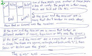 A logic puzzle! This one was taken from a book and modified to fit members of our family. Of the six people named, I had to figure out who the "giver" was.