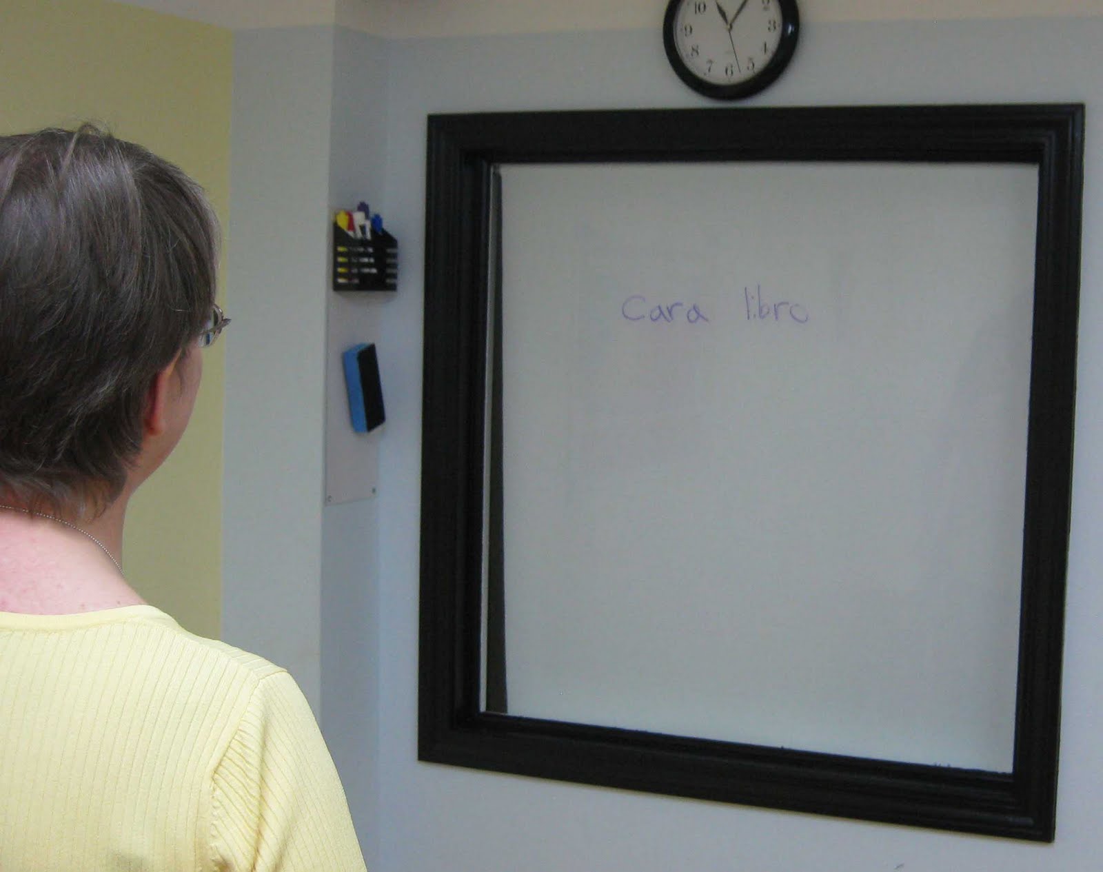 Hey! I recognize that mouse-brown hair. That's me, and it looks like I'm teaching school. I'm writing science stuff on the board. The next clue was either hidden in somebody's science book, or on the dry erase board.